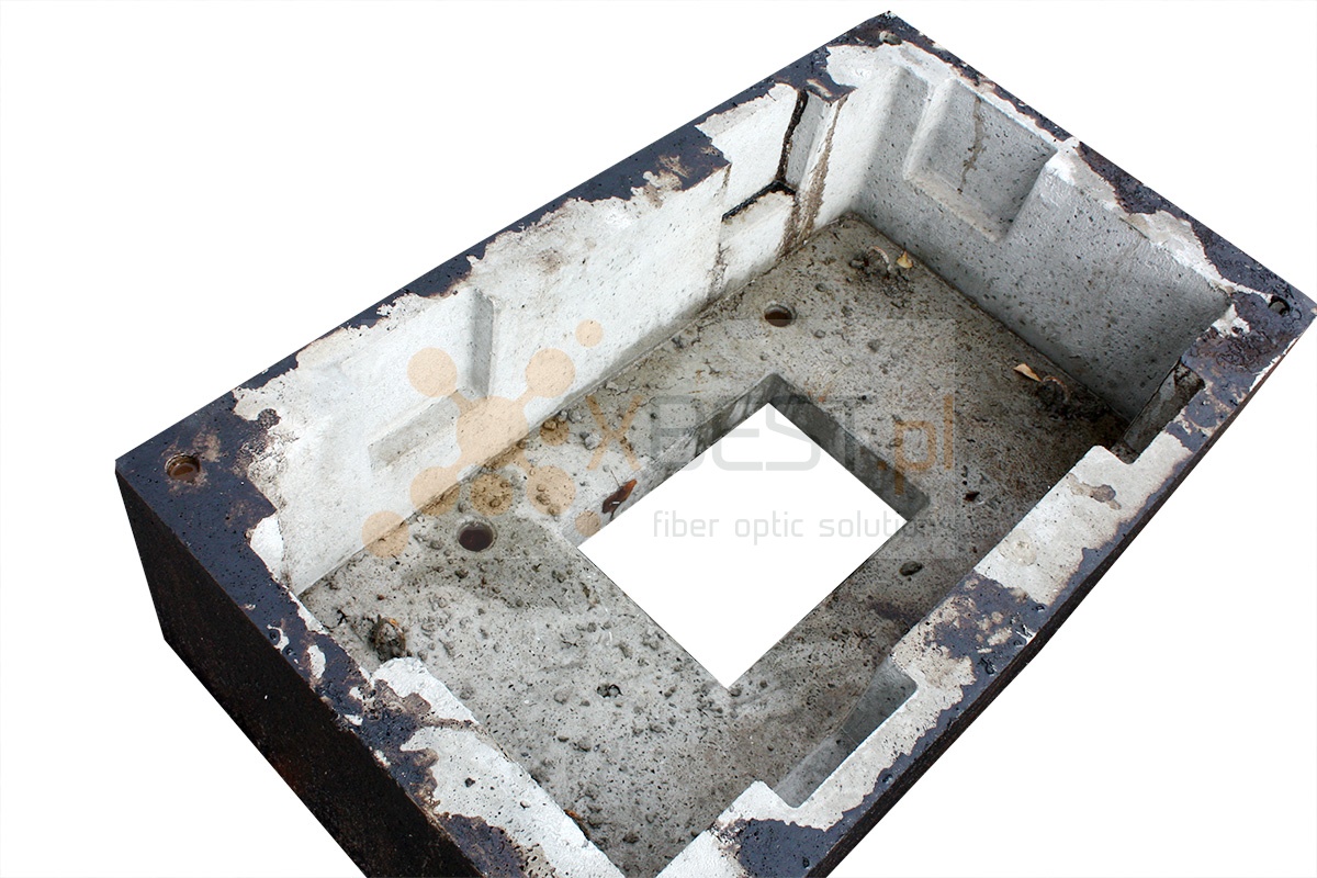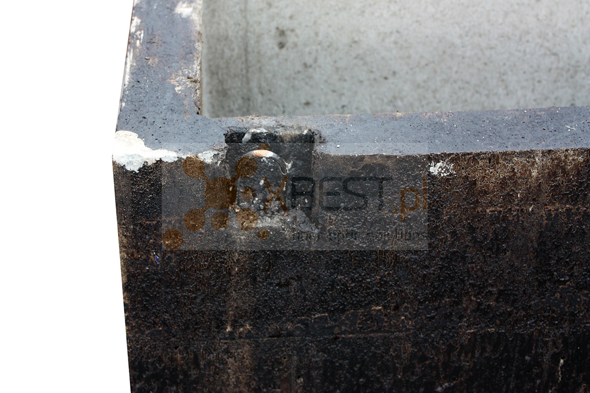 zaślepione otwory w kształcie trapeza na każdej ze ścian (szerokość u dołu 14cm, szerokość u góry 15cm, wysokość 14cm)
